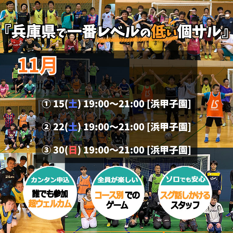 『楽しく 怪我なく ハイタッチ!』 をテーマに個サル(個人参加型フットサル)を開催しています。